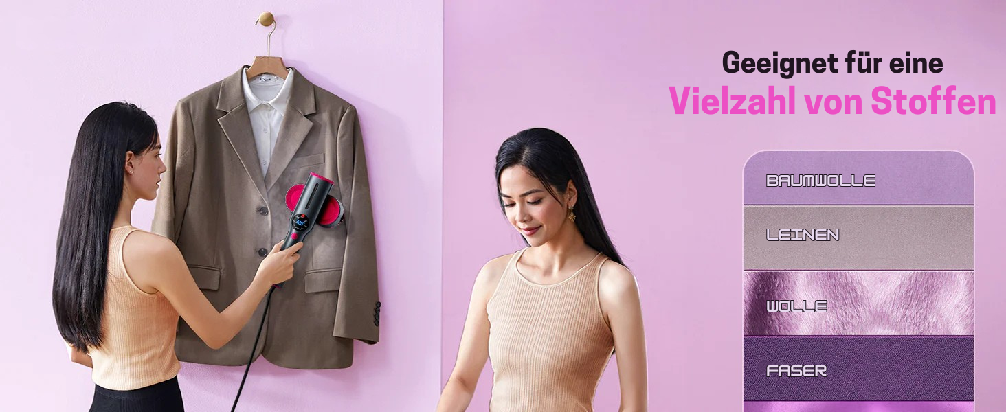 Geeignet für die meisten Stoffarten, darunter Baumwolle, Wolle, Seide und synthetische Materialien. Für empfindliche Stoffe wird eine niedrigere Einstellung empfohlen.